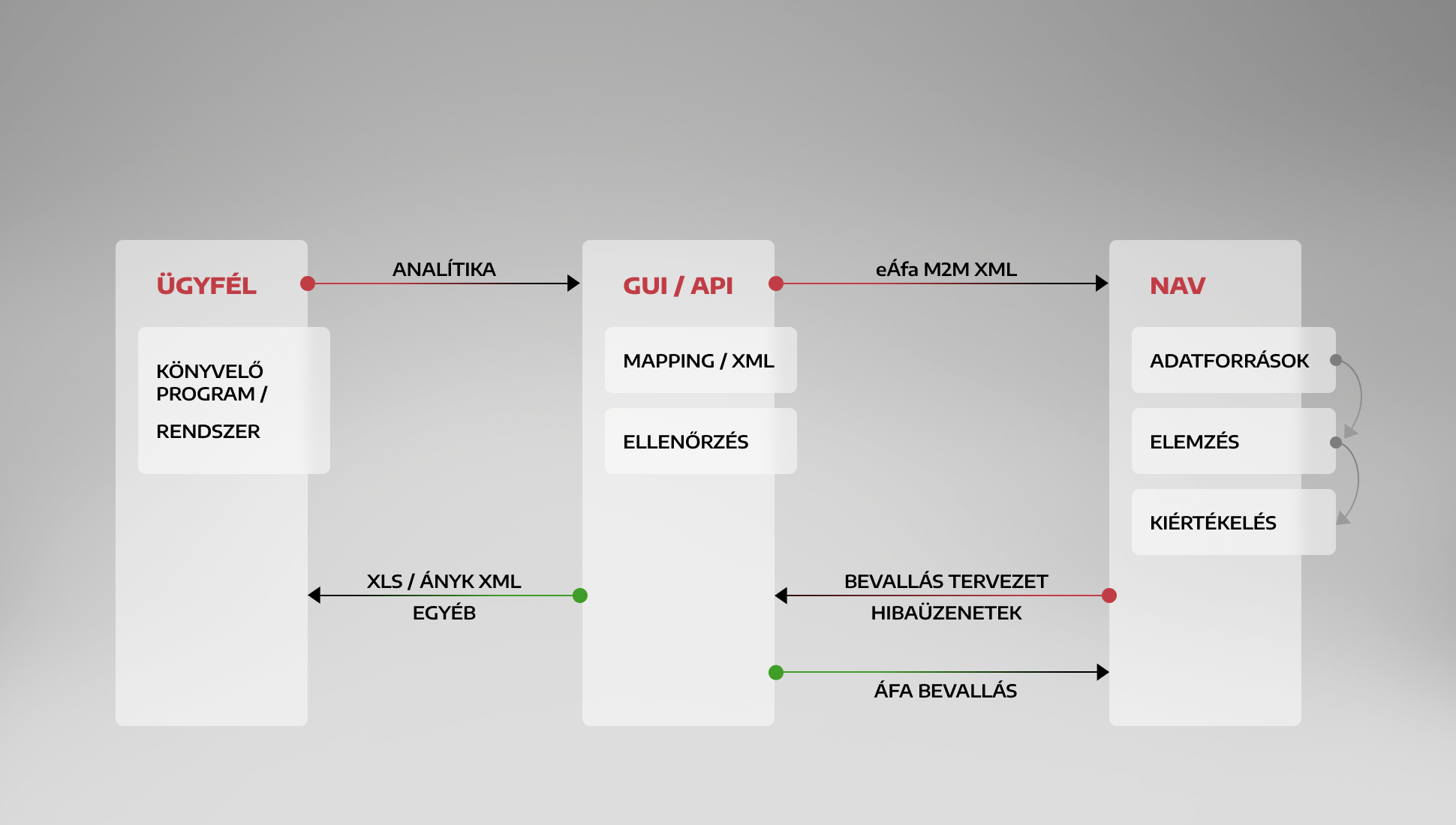 Az M2M rendszer lényegi eleme az adózó által összeállított nyers analitikának a NAV által kiajánlott adókódrendszerre való átfordítása és a standart adatstruktúrában való beküldése, illetőnek az adatok NAV általi validálása. Ennek köszönhetően létre jöhet a hatékonyabb adatfeldolgozás, és a bevallási folyamatba épített hibaellenőrzés.